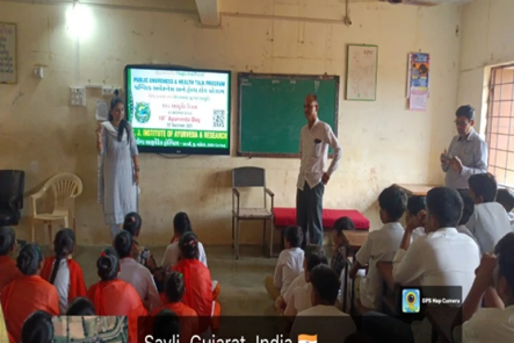 As a part of the 10th Ayurveda Day 2025 celebrations, Department of Swasthavritta , K.J.Institute of Ayurveda and Research, Savli, organized a Health talk on 18th September 2025 at Sanskarbharti Vidyalaya. .The topic for health talk was NUTRITION AND LIFESTYLE IN ADOLESCENTS. It was arranged in a high school in Natwarnagar area of Savli taluka. The students of class 9 th , 10 th , 11 th and 12 th attended the session. The health talk aimed to educate adolescents about the importance of nutrition and healthy lifestyle habits. The talk covered essential aspects of adolescent nutrition and inculcating lifestyle changes for prevention of lifestyle generating diseases in future.
