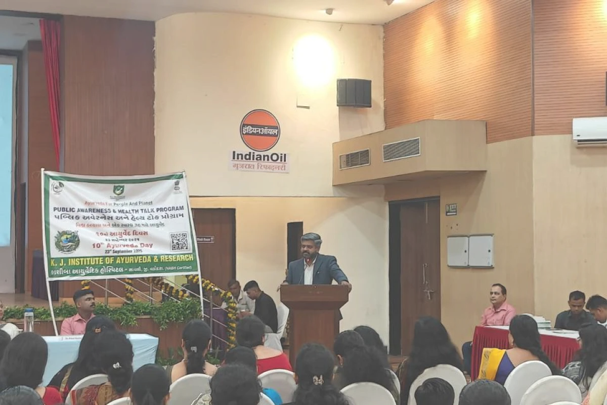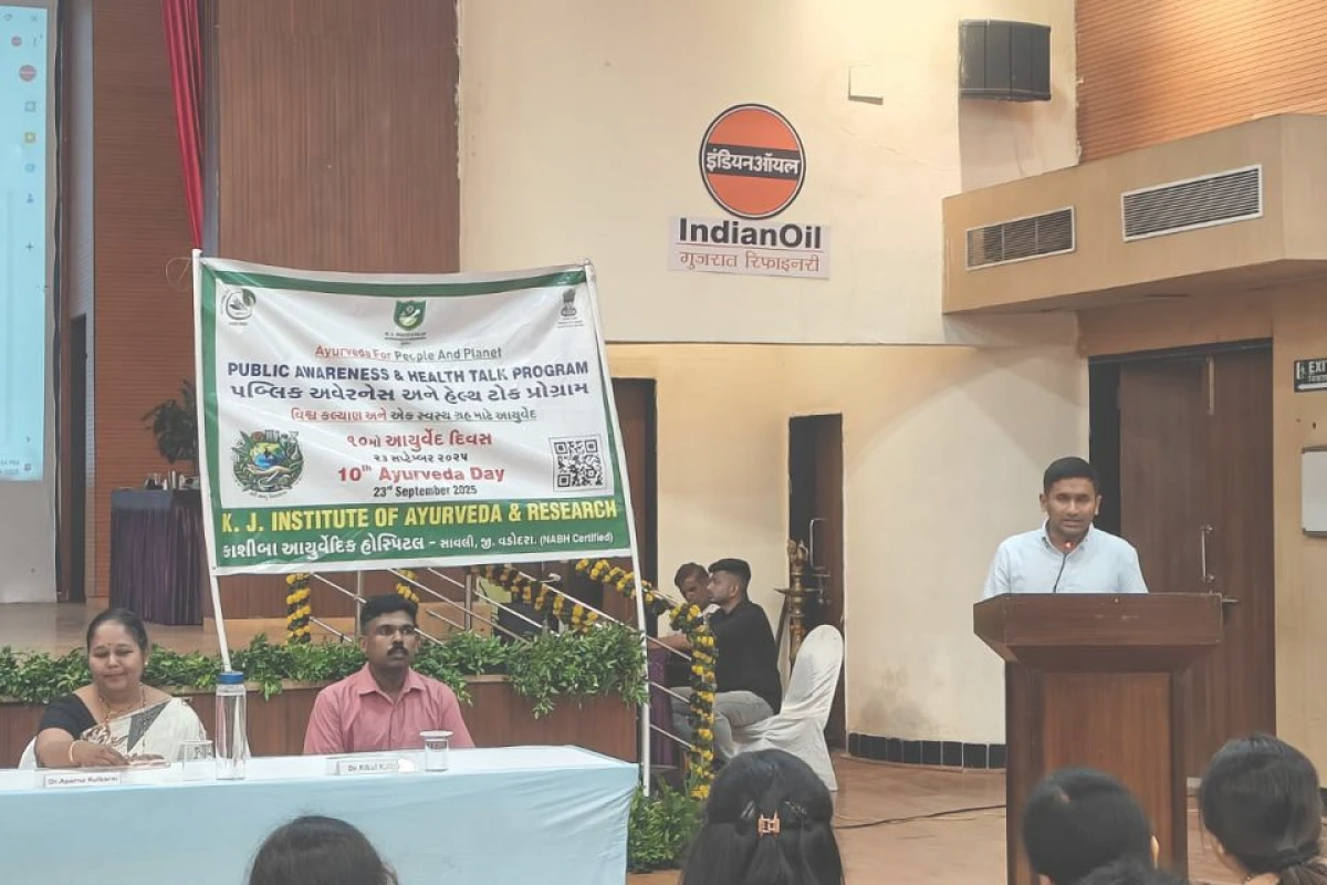 On 23rd September 2025 at 4:00 PM, the K.J. Institute of Ayurveda & Research, Savli, organised a special program at Spandan Hall, Gujarat Refinery, IOCL Vadodara, on the theme of Awareness and Outreach of Ayurveda among the Community. This initiative was held as per the special request from Gujarat Refinery, Indian Oil Corporation Limited.