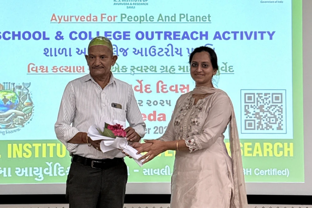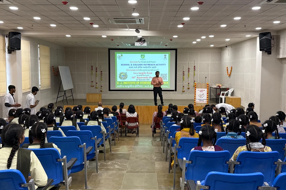 On the occasion of the 10th Ayurveda Day Celebration 2025, the Department of Samhita Siddhant & Sanskrit, K.J. Institute of Ayurveda & Research, Savli, organized a School Outreach Program – Interactive Session on Ayurveda on 15th September 2025 at S.B. Pandya Auditorium.