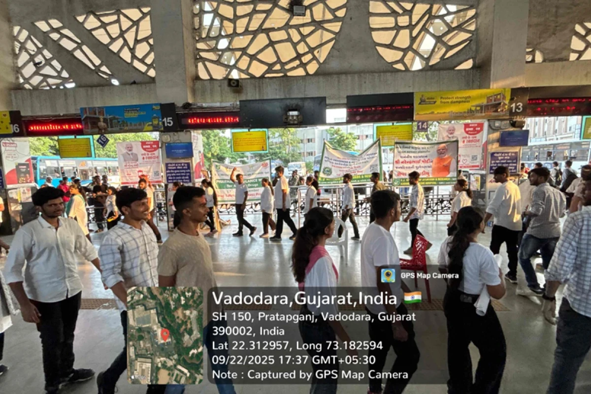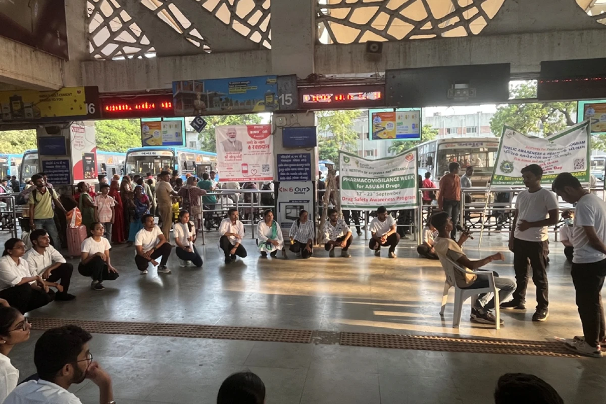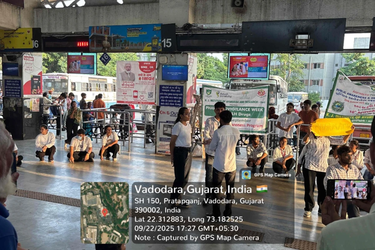 As a part of the 10th Ayurveda Day 2025 celebrations and Drug Safety Week (pharmacovigilance week), Department of Rasashastra and Bhaishjya Kalpana, K.J. Institute of Ayurveda and Research, Savli, organized a street play on “Drug safety Awareness” on 22nd September 2025. The event was aimed to spread awareness regarding the safe use of medicines and the importance of reporting adverse drug reactions (ADR). The aim was to educate both students and the community in a creative, impactful and easy to understand manner. The event was organized at Central state transport bus depo, Vadodara. The enthusiastic students of 2nd year BAMS who perform street play very well.